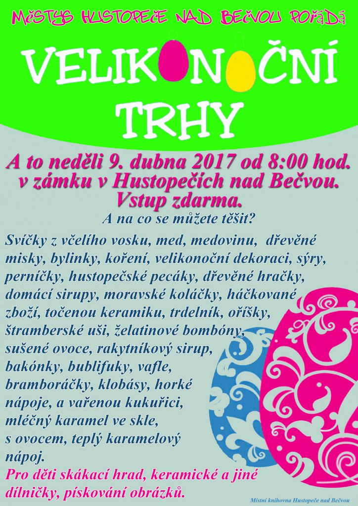 V neděli 9.4.2017 od 8:00 do 13:00 hodin v zámku v Hustopečích nad Bečvou.Pro děti skákací hrad a dílničky.
