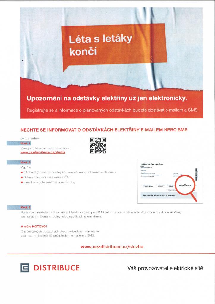 Léta s letáky končí! Zaregistrujte se na www.cezdistribuce.cz/sluzba a dostávejte informace o odstávce elektřiny pohodlně e-mailem či SMS. Papírová oznámení už ve svém okolí od 1. 1. 2021 nehledejte. Plníme tak přání našich zákazníků a chráníme naši přírodu. Informace o plánovaných odstávkách budou nadále zveřejňovány také na www.cezdistribuce.cz/odstavky a zasílány na dotčené obce k vyvěšení na úředních deskách a případně k další komunikaci dle místních zvyklostí.