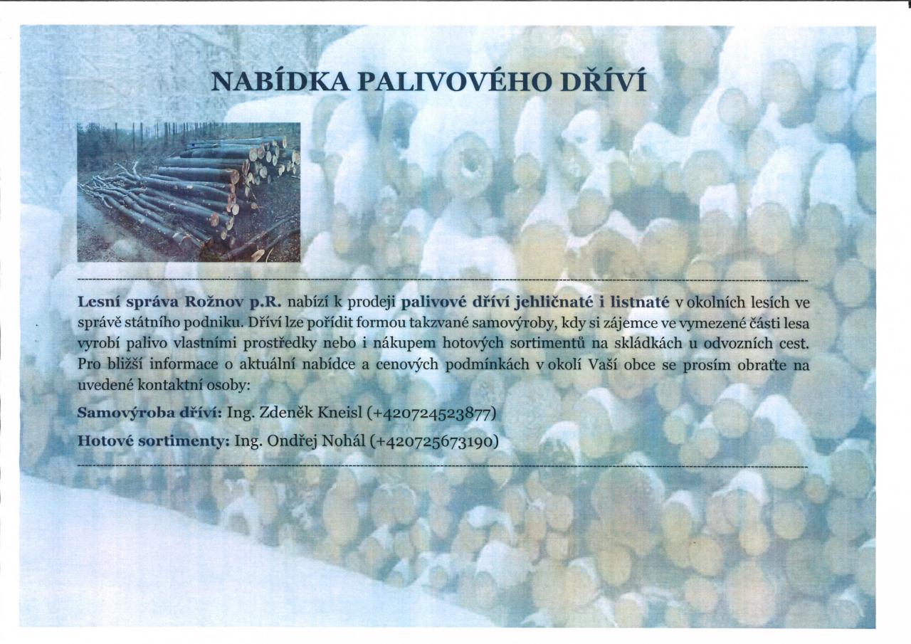 Lesní správa Rožnov p.R. nabízí k prodeji palivové dříví jehličnaté i listnaté v okolních lesích ve správě státního podniku. Dříví lze pořídit formou takzvané samovýroby, kdy si zájemce ve vymezené části lesa vyrobí palivo vlastními prostředky nebo i nákupem hotových sortimentů na skládkách u odvozních cest. Pro bližší informace o aktuální nabídce a cenových podmínkách v okolí Vaší obce se prosím obraťte na uvedené kontaktní osoby: