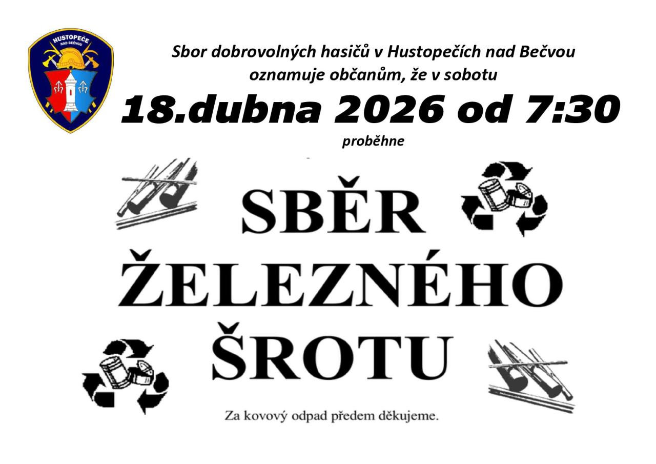 Sběr železného šrotu v Hustopečích nad Bečvou proběhne v sobotu 18.4.2026 od 7:30 hod. Za kovový odpad předem děkují hasiči z Hustopeč.