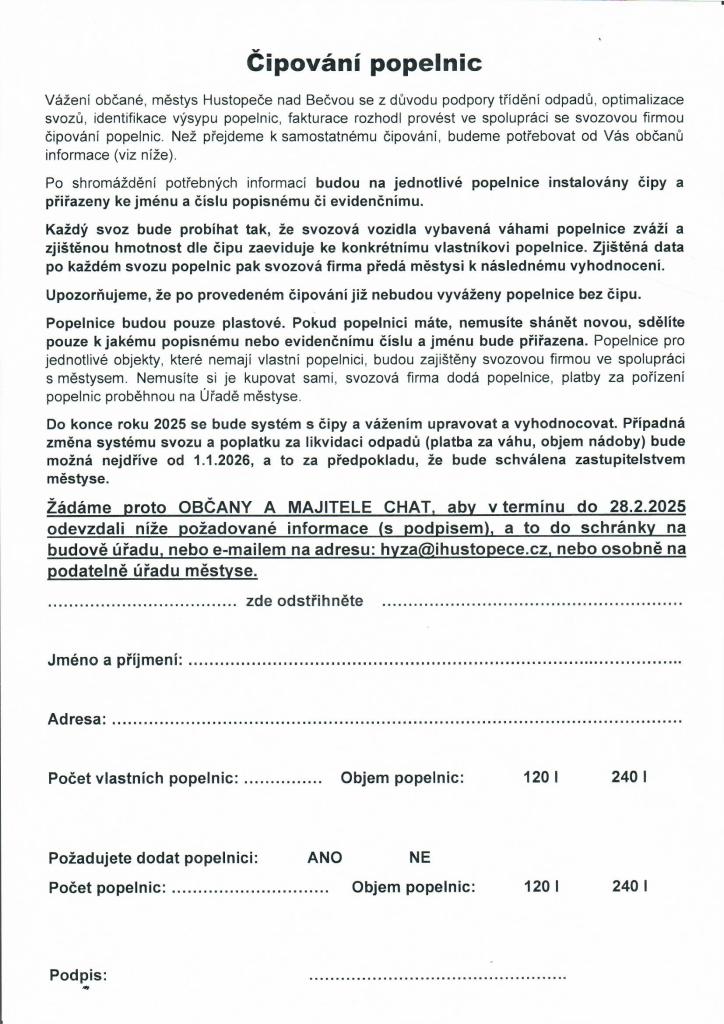 Formulář "Čipování popelnic" jste obdrželi do svých poštovních schránek. Prosíme o vyplnění a zaslání na níže uvedenou emailovou adresu nebo vložení do poštovní schránky, která je umístěna ve vestibulu Úřadu městyse Hustopeče nad Bečvou.