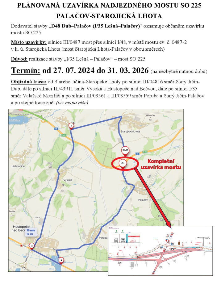 Objízdná trasa: - od Starého Jičína-Starojické Lhoty po silnici III/04816 směr Starý Jičín-Dub, dále po silnici III/43911 směr Vysoká a Hustopeče nad Bečvou, dále po silnici I/35 směr Valašské Meziříčí a po silnici III/03561 a III/03559 směr Poruba a Starý Jičín-Palačov, a po stejné trase zpět.